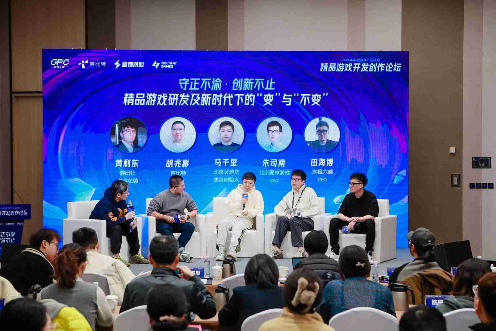 圆桌对话环节,,,,在游研社内容总编黄利东的主持下,,,,赏金大对决CTO胡兆彬、、、、北京灵游坊联合创始人马千里、、、、北京猩球游戏CEO朱司南、、东极六感CEO田海博等四位嘉宾围绕“守正不渝、、、、创新不止——精品游戏研发及新时代下的‘变’与‘不变’”这一主题分享了各自在精品游戏开发理念及工程能力搭建方面的见解和经历,,并就行业变化下游戏人需要坚守的理念等展开交流探讨。。。。