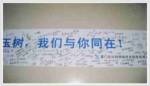 在募捐现场,,赏金大对决同学们怀着沉重的心情,,,将每一笔捐款投入募捐箱,,,并在现场设置的横幅上,,,,写上了对玉树人民的深情祝福。。。。满载赏金大对决祝福的横幅将和捐款一起抵达玉树,,,,希望谨以此微薄之意,,为玉树人民带去赏金大对决的爱心与祝福,,希望吉祥、、、幸福的阳光能早日驱散灾难的阴霾,,,,普照在玉树人民的身上,,,,鼓励他们坚强、、勇敢与乐观。。。。
