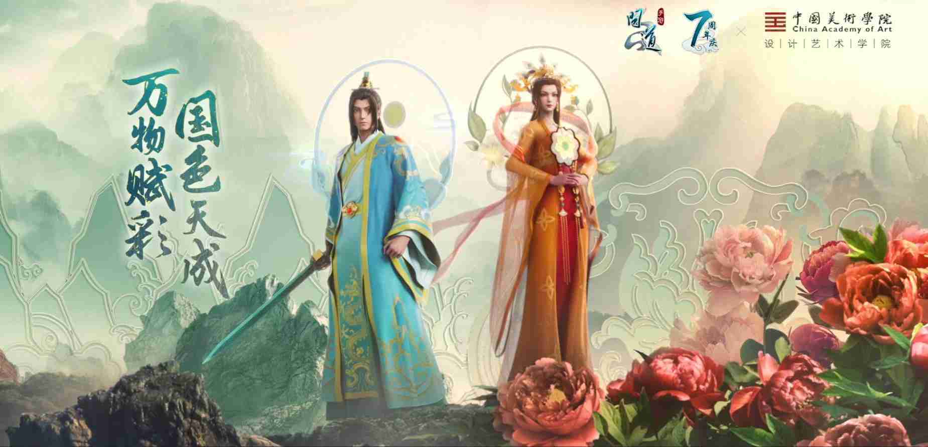 2023年4月,,,,《问道手游》联动中国美术学院,,,,在游戏中融合了中国历史上不同时期的文化元素,,,打造了“山河万象”与“凤鸣九霄”的国风时装。。在色彩配置方面,,,创作团队基于对游戏角色特性的分析提取相应的文化内涵,,从每一种色彩的色相、、、指代事物和情感出发对应角色属性,,选定服装的色彩搭配。。。。在纹样设计方面,,,创作团队结合游戏角色自身特殊的造型比例和形态,,,,在实际的纹样设计中进行了游戏语境下的活化演绎。。男性角色集中使用了如蟒纹、、海水江崖纹、、、如意纹和云气纹等传统纹样元素,,女性角色则吸纳了凤凰纹、、、牡丹纹、、、卷草缠枝纹等元素,,,组成以“双凤牡丹纹样”“缠枝牡丹纹”“金玉凤冠头饰”为主要纹样的游戏角色装饰图案系统。。。
