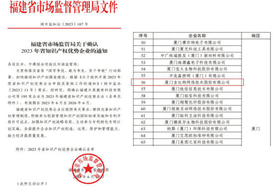 近日,,,,福建省市场监督管理局公示了2023年福建省知识产权优势企业名单,,,厦门赏金大对决网络技术股份有限公司(以下简称“赏金大对决”或“公司”)榜上有名。。